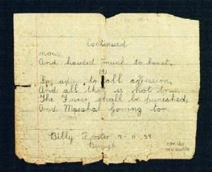 This poem was found in between the leaves of an old register by archivists from the Public Records Office in Northern Ireland.The register was from the Lincoln Memorial School.The poem is by Billy Foster and was written in november 1939