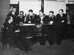 During the long winter months from 1941 to 1944, we tried to do the utmost with our own resources at Lowestoft to provide lots of music, song and dance, and we endeavoured to amuse not only the navy men but also the several hundred landladies in the town who had been billeting thousands of our men throughout the time that mobilisation of the fishing fleet began in the summer of 1939. We were even able to take our shows out to the USAF Airfields close to Lowestoft. Freddie Gardner's Saxophone really "sent them"!! They would never let him leave the stage.
