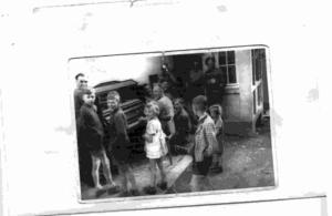 Germany. 8th May 1945. Left to right: David Harvey (my Dad), Joe Wills, Stan Hitchcock, Harry Farr, Unknown, Len Griggs, Leslie Hudson, Frank Lord. The above all soldiers of the 33 Construction Section, Royal Corps of Signals. On VE Day, they stole a piano, shoved it out into the street where they had a sing-song. They also stole a barrell of beer from the sergeants' mess. Their offence was discovered, without reprimand, and they were told not to do it again. The children are German.