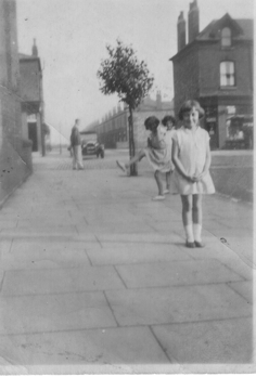 Irene M. M. Taylor in a Street just off Liverpool Road, Eccles circa 1931 with Jack Ormesher close by his soft-top car and two local children in on the photo