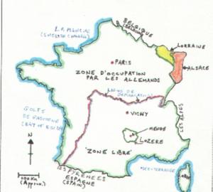 Sketch map of France during WW2 showing the location of Mende, Lozere and the Demarcation Zone (Sketch by the author)
