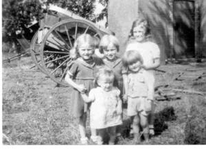 From left to right back row, Stella aged 7, Evelyn aged 6 Maisie aged 9, Front row Elizabeth aged 1 1/2, Jimmy aged 4. They arrived in Kingston Seymour in Somerset, during October 1940.