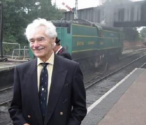 Ted Brister in front of the locomotive named after his squadron. Sheringham Station, September 2004