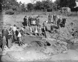 The following year my family moved to Earl Shilton in Leicestershire and the closest I came to being bombed again was when a damaged German Dornier in panic dropped a 2,000 pounder in a field nearby. Apart from killing a pig, it did no other damage but my brother and I, cocky little city types in school caps, stood on the edge of the crater for the photographer.