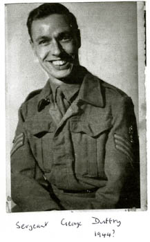 My husband, George Duffty was born at 6 Hammond Street, Leeds, in a small 'back to back' house. Later the family moved to a new estate. He had two younger brothers, and stepbrothers, and stepsisters, who were also cousins - not all living at home. Despite the smallness of the house, they had a piano. George went to Ellerby Lane School and he and his two brothers enjoyed camping and cycling and, most of all, visiting their aunt who had gone into service near Dublin and had married. On leaving school he went into advertising and passed the Preliminary and Intermediate exams of the Advertising Association.