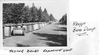 Occupied the Krupps bomb dump. Came across a large number of flying bomb units and their explosive drums, rather like large dustbins. Very thin casing to increase the blast effect. We took over a large farm area and used the farmhouse as our firing point with 7 demolition sites about 300 yards away. As the ceasefire had been declared we were very much restricted. The farmer was allowed to work from 4 pm to 9.30 am, when we took over, destroying bombs all day. We had guards posted for safety. Lost some 50 tons of explosive when one load did not explode. F/Sergeant did not report this. Later when we fired a new load the lost one blew as well, causing damage to the nearby village and partly destroying our firing point (farmhouse). Commanding Officer always blamed.