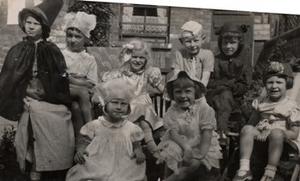 A group of friends aged about six or so taken at a birthday party in back garden (West Bridgeford) in 1941 probably