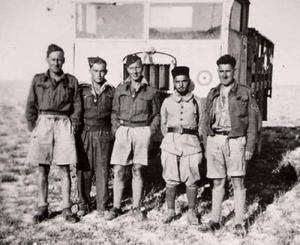RAF 80 Wing Type 'M' Signals Unit Service team 'on the road' somewhere in N. Africa 1943. Left to right : Flt Lt D.P. Taylor, LAC Green, Sgt Fred Thompson, "Pierre", Cpl Frank Baxter.