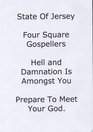 Suddenly along the quayside walked a figure bearing a billboard saying ' Jersey Four Square Gospelers. As he walked along the quay oblivious of the danger from machine gunfire he handed out leaflets. I accepted mine appropriately. Hell and Damnation is Amongst You. Prepare to Meet Your God.