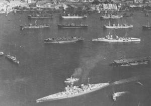 HMS Rajah is seen here off the stern, starboard quarter of the Battleship HMS King George V. The photograph was taken by one of the Rajah's aircraft while anchored in Colombo Harbour. (Photograph, Crown copyright).