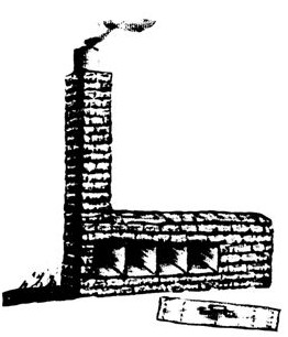 Now I was able to start building, and mixed up another lot of mud to use as mortar. I dug a long fire-pit with a low wall each side, and built in the oblong tins resting cross-ways over the fire, all the open ends facing the same way. The fire was to be drawn up to the far end of the tins, and back over the tops, and I intended to build the chimney over that end to draw the heat and carry the smoke away.