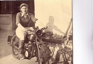 This is Jean on her motorbike in Norfolk wearing her Land Army clothes. Note the blackout on the headlight. Because of this she fell off in the dark and bore the scar forever.