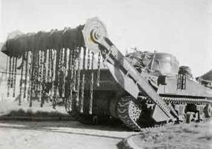 One of our Churchill "Flail" tanks modified to clear a path through mine fields. The chains flew round and banged down on the mines before the tank went over them!