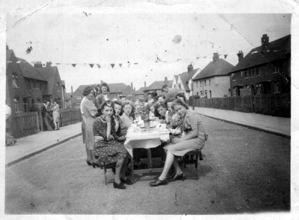 VE Day street party in Acacia Road, Bedford. Sitting front left - Rene Hartwell, sitting second left - Miss Pack, sitting front right - Joyce Williams sitting second right - Miss Maxey Mrs. Darlow first lady standing on left