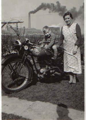 Picture of my husband Dennis's BSA, his brother and Mum,taken from Costhorpe.In the background Firbeck colliery can be seen.