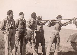 Stanley Painter and colleagues gun cleaning in Egypt 1944 - the caption on the back of the photo reads: "The lazy man is on the left"