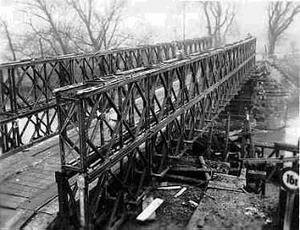 A small town in northern Belgium 5 or 6 miles from Bruges, a small Bailey bridge had to be dismantled for transporting to the Dutch border. Work began after darkness fell and meantime two of us had crossed the bridge and got chatting to a resident who spoke good English; he asked us back to his home for a coffee and to meet his wife and two children, they all spoke English well. We had seen a gap in the houses opposite and asked what had happened, he said a B52 bomber had lost an engine which crashed through the house and the plane came down just clear of the town. We set off back to camp not knowing the bridge had gone, the only alternative was go across on the lock gates, fortunately there was a guide rail to help but with the water 20feet or more below it was a little scary. The next move was to Holland.