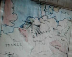 A hand-drawn map showing the travels of a prisoner...from Jeff Hampson's diary. He was a prisoner from November 1943 until 1945.