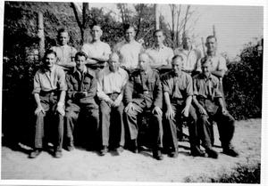Our N.C.O. was a regular soldier, Sgt. Tim Crawley, who came from Aldershot. He was a very lively character and always good for a laugh. The Germans gave us a weekly paper in English called The Camp which we read with considerable scepticism. In one issue there was an article extolling the merits of Gen. Rommel. One sentence read, "At the dreaded name of Rommel pious Catholics have been known to cross themselves." Tim would come into the room and shout the name of Rommel and collapse into a gibbering heap, crossing himself fervently to roars of laughter from the rest of us. He used to tell of being called out by the guards at his last camp in the middle of the night to fight a fire. He dreamed of heroically rescuing women and children and being sent home by a grateful German government as a reward. His dream was shattered when he was handed a shovel and marched to the local gasworks where a pile of coke was on fire. It was mid winter, and very cold, and in the end they were shovelling the coke back on to the fire to keep warm. Such homespun humour and the laughter it brought must have had a beneficial effect on all of us.