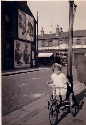 The picture of me on my bike was taken circa 1940, the houses on the left later taking a direct hit. The other picture shows the shop in Tunnel Road, which did survive- though has long since been demolished.