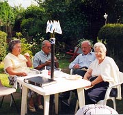 left to right:- Marjorie Williams, Harold Williams, Emil Weingartner and Edna Weingaernter chatting in the garden at Stowmarket. 2004