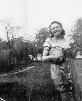 Peggy Overin, with a banjo, entertaining the troops circa 1943.