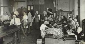 Dad's factory at Gt.Eastern Street. Jack is wearing a tie, Dad is wearing an apron, I am fixing a machine and Lou is opposite me.