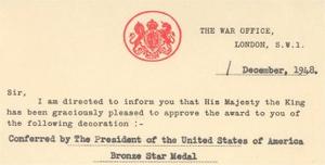 The President of the United States of America, authorized by Executive Order, February 4, 1945, has awarded the Bronze Star Medal to