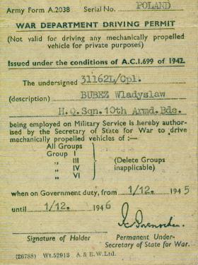 My late father served in the Polish 1st Armoured Division and this is his driving permit. For a short time after the war, I understand it was possible to exchange this for a civillian licence. My father never did this, believing he would never own a car and indeed, once out of the army in 1947, he never drove again.