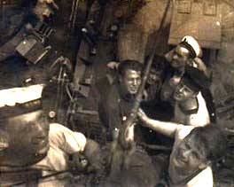 LIFELINES WERE RIGGED FOR ROUGH WEATHER FROM THE BREAK OF THE FORECASTLE TO THE STERN .WE WOULD WAIT AT THE DOOR OF THE MESSDECK..WAIT FOR THE UPROLL ON THE LEE SIDE AND THEN MOVE AFT AS FAST AS WE COULD BEFORE THE DOWNROLL .OFTEN THE SHIP WENT GUNWHALES UNDER