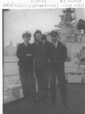 R.J. Mundy + 2 mates on HMS Belfast 1945