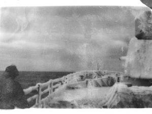 Smithy and I were waiting for the drifter (small boat) to go ashore, there was a storm blowing, when it came along side, smithy misjudged the rise and fall of the boat, fell about fifteen feet twisted his ankle slipped on the wet deck and broke his leg.