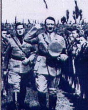 This photograph was taken in 1934 at the annual youth rally at the National Socialist Assembly on the Strength of the Party. The man following Hitler is Baldur von Schirach, the Reich Youth Leader. His father was Carl Bailer von Schirach, an officer in the prestigious Garde-Kürassier Regiment Willhelm II. In this picture Schirrach was 27. He was sentenced to 20 years at Nuremburg and released in 1966; he died in Kröv on 8 August 1974. I recognised the photo at once because it is widely known. It first appeared in a German propaganda book edited by Goebbels called "Adolf Hitler - Pictures from the Life of the Führer" published in 1936 at page 110. But it has been reproduced many times since, for example in "Hitler - A History in Photographs" edited by Herbert Walther, at page 79.