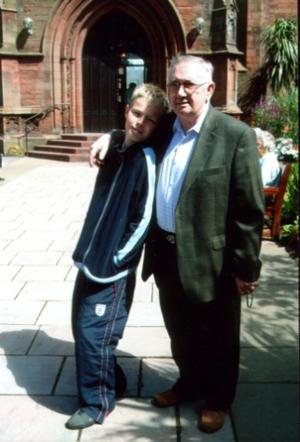 6 August 2005: Chris Coyne (left) and his Granddad Tom Coyne, St Nicholas’ Church Tower, Whitehaven, Cumbria. In front of the WW2 Memorial inside the church, Tom told me about his father, Tom (Senior), who lost his life when the M.V. Neptunian was torpedoed in 1940.