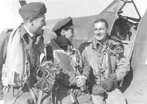 P/O 'Happy' Harrison of Rakaia New Zealand; F/Lt Schader of Wellington New Zealand and S/Ldr Richard Webb of Gisbourne New Zealand, who took part in the action in which a Spitfire Squadron of the Northwest African Coastal Air Force shot down four ME109's in five minutes