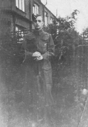 Eventually, this torture finished and we all went off to a college and it was a college for clergymen. Not being in use of course, at the time, but for training clergymen in Hertfordshire or Herefordshire or wherever it rains or doesn’t rain. And we’re ensconced on bare boards — there was not a stick of furniture — if that’s the right word, for that matter. Not a stick of furniture in this college; bare boards. We had a couple of, they were called, inter-linking mess tins. Very rightly so, too. They made a right bloody mess! You had a pint of tea in one and whatever it was going for eats in the other one. That was probably sloppy, as well. So you would try to walk along with these two oblong cans balanced one in each hand to find somewhere to sit to eat and drink whatever it was they were dishing up. This was for your nightly meal. Then of course, there was nothing else to do no telly, of course, no Match of the Day to watch. We settled down (to sleep) and all we had was our overcoats. Now what do you do with your overcoat? Do you lie on it, or do you lay over it — do you lie on it or do you lay with it over you, or do you try and get it round you. We finished up by putting them on. It seemed to be the only way to make full use of the material that was available. The idea was of course to keep you warm enough to sleep during the night. The next morning (if you could call it next morning, because this must be about midnight by the time we’ve finished with all this messing about) — early morning we had to be out in the fields somewhere.