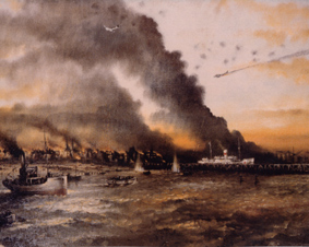 The town was a shambles as we threaded our way through the bombed streets. Flames licked out of the pavements as the gas mains had ignited and there were dead bodies lying around. We eventually found our way to the dockside. The warehouses had been bombed and all the wounded lay on stretchers in the open with no protection and no sign of a hospital ship. An ambulance drove into the dock, as the driver lost control and it was full of wounded.
