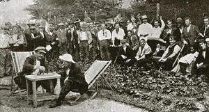 Civilian internees playing chess in this 1915 German propaganda postcard from Ruhleben Camp.