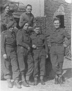 'Just before crossing the Rhine'. Signallers of 232 Battery. Leslie Harry on right.