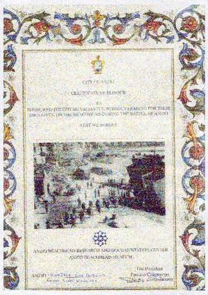 The picture is a copy of a Certificate of Honour from the Mayor of Anzio.