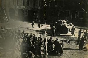 A british armoured car belonging to A Squadron 5 troop 12th Royal Lancers (recce for the Second New Zealand Division). 600 Germans surrendered after Spitfires appeared. I can be seen on the right of the image with my hand held aloft.