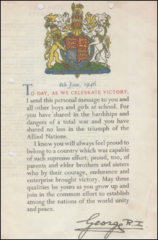 TODAY AS WE CELEBRATE VICTORY, I send this personal message to you and all other boys and girls at school. For you have shared in the hardships and dangers of a total war and you have shared no less in the triumph of the Allied Nations.