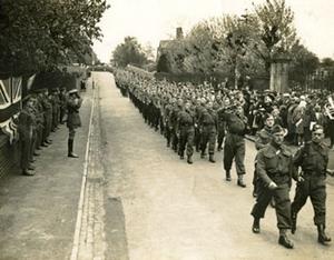 This photograph was taken of the Home Guard in Wellington, as they marched down Sutherland Avenue, past Wrekin College.