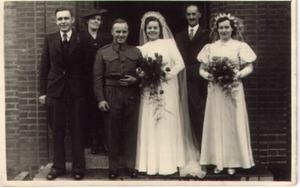 A happy ending. Two days late on 8 February 1945 ACW1 Marie Cranfield marries Private Ronald Ritson, RAMC, at St Chad's Church, South Norwood, London. Also in the photograph are the bride's parents, bridesmaid Joyce Cranfield and Best man Tom Ritson.