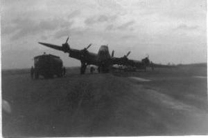 This Stirling was taken on a test flight by the duty crew, after a service. On landing approach the crew were informed from the tower that the undercarriage was “waving about in the slipstream”. One of the legs had collapsed and the crew had to land the aircraft as shown in the picture.