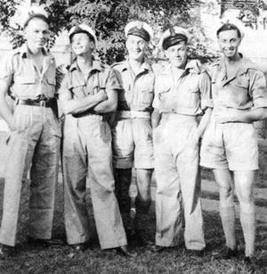 Reg Voller, (centre) and friends, after the landings were complete at Madagascar.