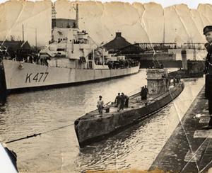 HMS Grindall at Liverpool Dock — Grindall picked up the German Sub in the Atlantic and towed it in with crew onboard.