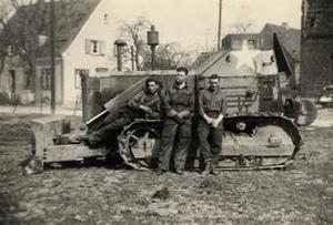Ralph Rayner (centre) with his bulldozer in Normandy. Relaxing with pals after the battle.