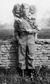 Patrick O'Doherty in Home Guard uniform with daughters Doreen and Sheilah. February 1942 outside Reymills Cottage, Lacock