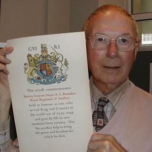 Albert Ramsden with the scroll sent to the family after his father died three weeks before VE Day